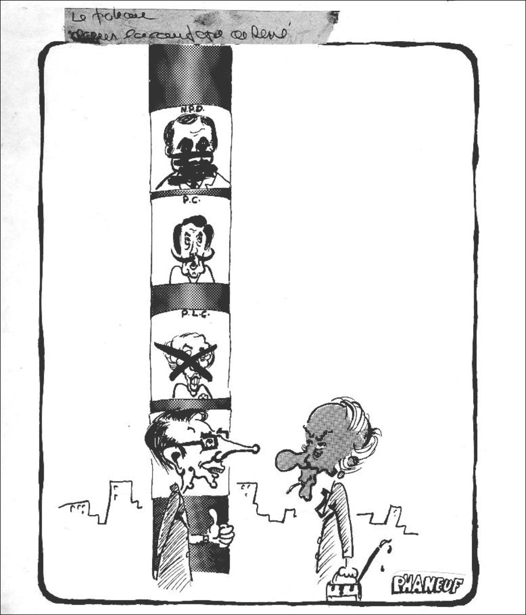 Fabien Roy et René Lévesque admirent les ratures de ce dernier sur les portraits de Joe Clark, Ed Broadbent et Pierre Elliott Trudeau