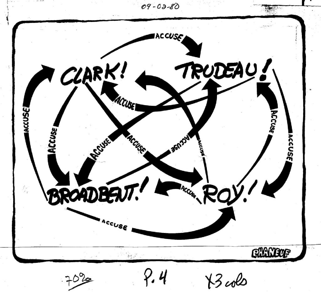 Enchvêtrement de politiciens s'accusant mutuellement. Les politiciens sont : Joe Clark, Pierre Elliott Trudeau, Ed Broadbent et Fabien Roy