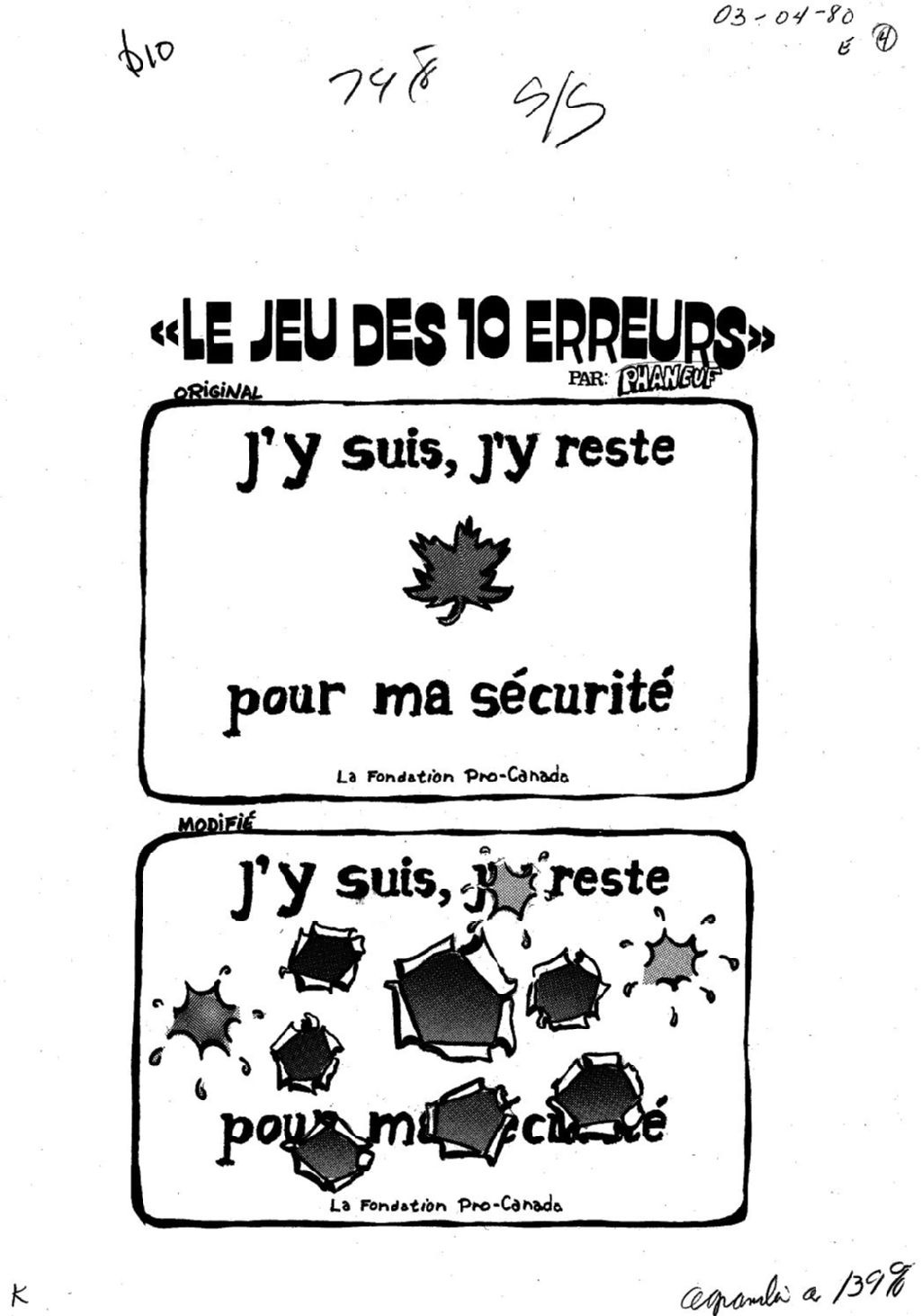 Dans la première image le message est le suivant : J'y suis, j'y reste pour ma sécurité. Dans la seconde image, les dix erreurs symbolisées par les dix provinces canadiennes sont représentées par dix trous