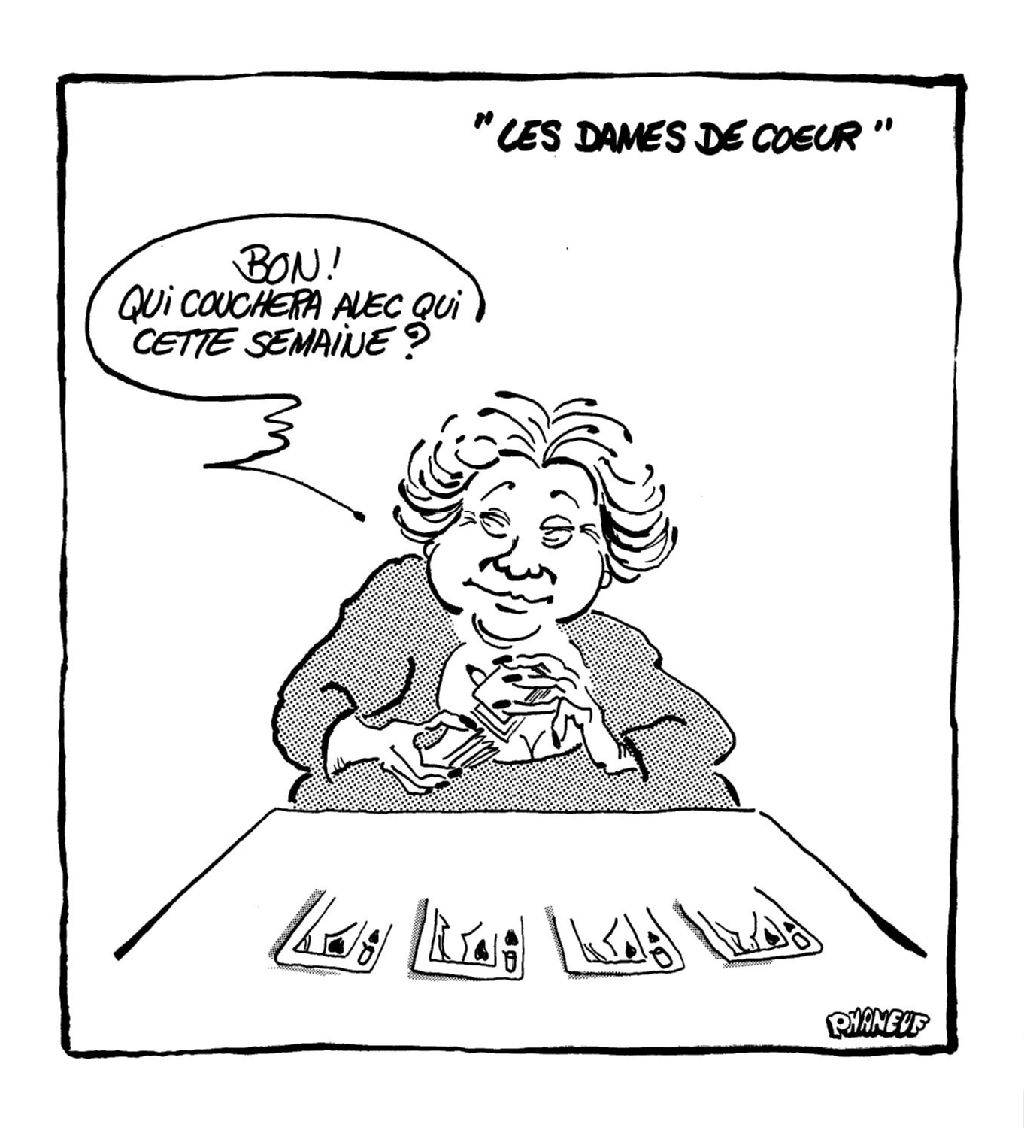 Lise Payette tire aux cartes l'intrigue amoureuse de son téléroman. Cette dernière dit : "Bon! Qui couchera avec qui cette semaine?"