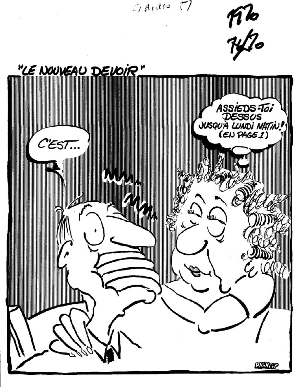Une femme fait taire son mari lorsqu'il veut vanter la nouvelle présentation du Devoir. La femme pense : "Assieds-toi dessus jusqu'à lundi matin! (en page 1)"
