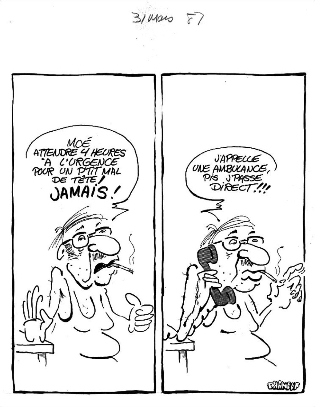 Dans la première partie de la caricature, un homme dit : "Moé attendre 4 heures à l'urgence pour un p'tit mal de tête! Jamais!" Dans la deuxième partie de la caricature, l'homme est au téléphone et nous révèle sa solution. Il dit : "J'appelle une ambulance pis j'passe direct!!!"