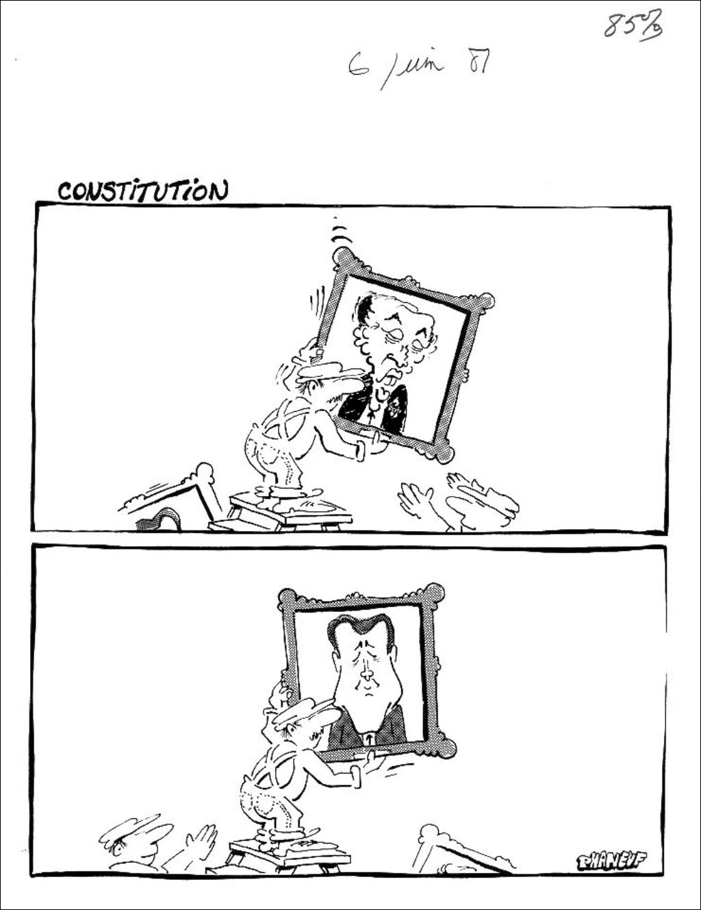 Dans la première partie de la caricature, des hommes enlèvent le portrait de Pierre Elliott Trudeau. Dans la seconde partie, des hommes installent le portrait de Brian Mulroney