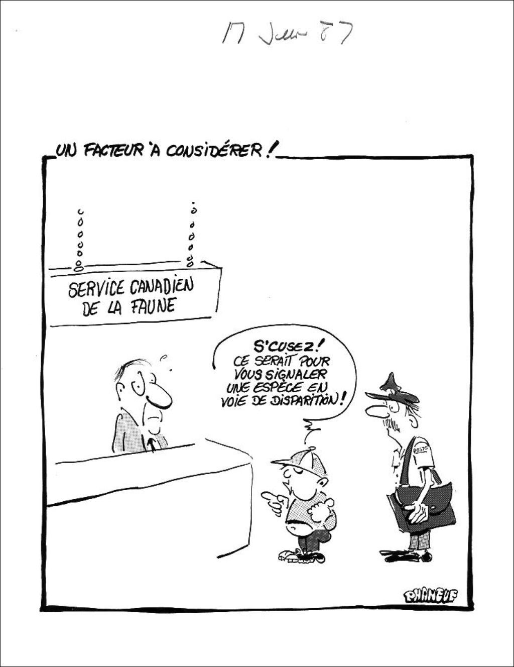 En pointant un postier, un garçon va au Service canadien de la Faune et dit : S'cusez! Ce serait pour vous signaler une espèce en voie de disparition!"