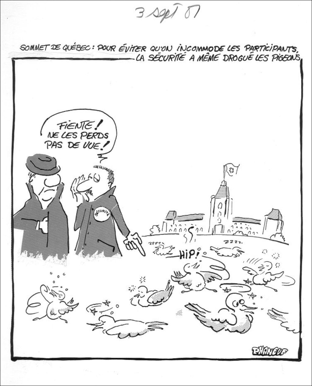 Sommet de Québec : pour éviter qu'on incommode les participants, la sécurité a même drogué les pigeons, 3 septembre 1987, Archives nationales à Montréal, Fonds Jean-Marc Phaneuf, (06M,P575,S4,SS4,P372), Jean-Marc Phaneuf.