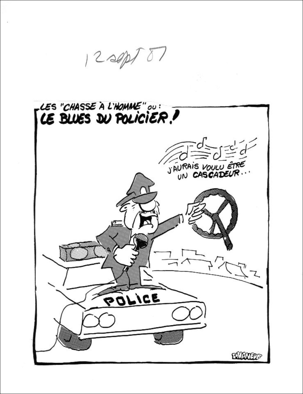 Les chasse à l'homme ou : le blues du policier, 12 septembre 1987, Archives nationales à Montréal, Fonds Jean-Marc Phaneuf, (06M,P575,S4,SS4,P375), Jean-Marc Phaneuf.
