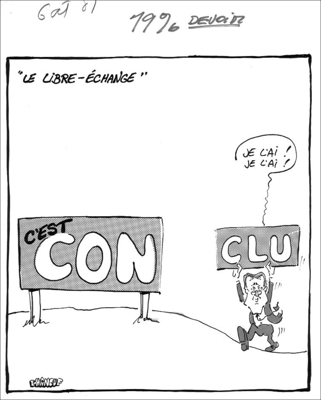 Sur une partie d'une pancarte est inscrit : "C'est con". Brian Mulroney arrive avec la balance de la pancarte où il est inscrit : "clu" et il dit : "Je l'ai! Je l'ai!"