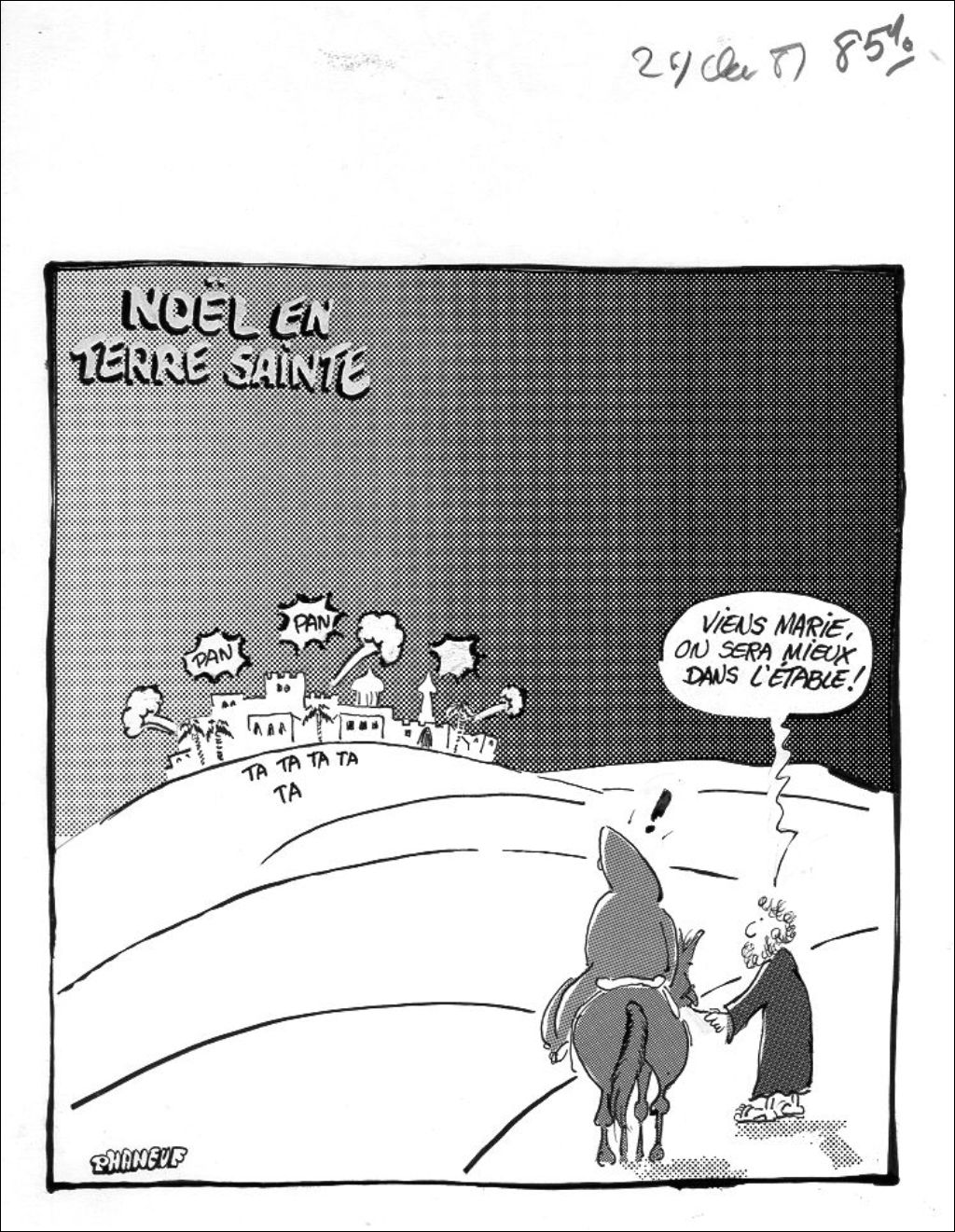 En entendant des coups de feu provenant de la ville, Joseph dit à Marie : "Viens Marie, on sera mieux dans l'étable!"