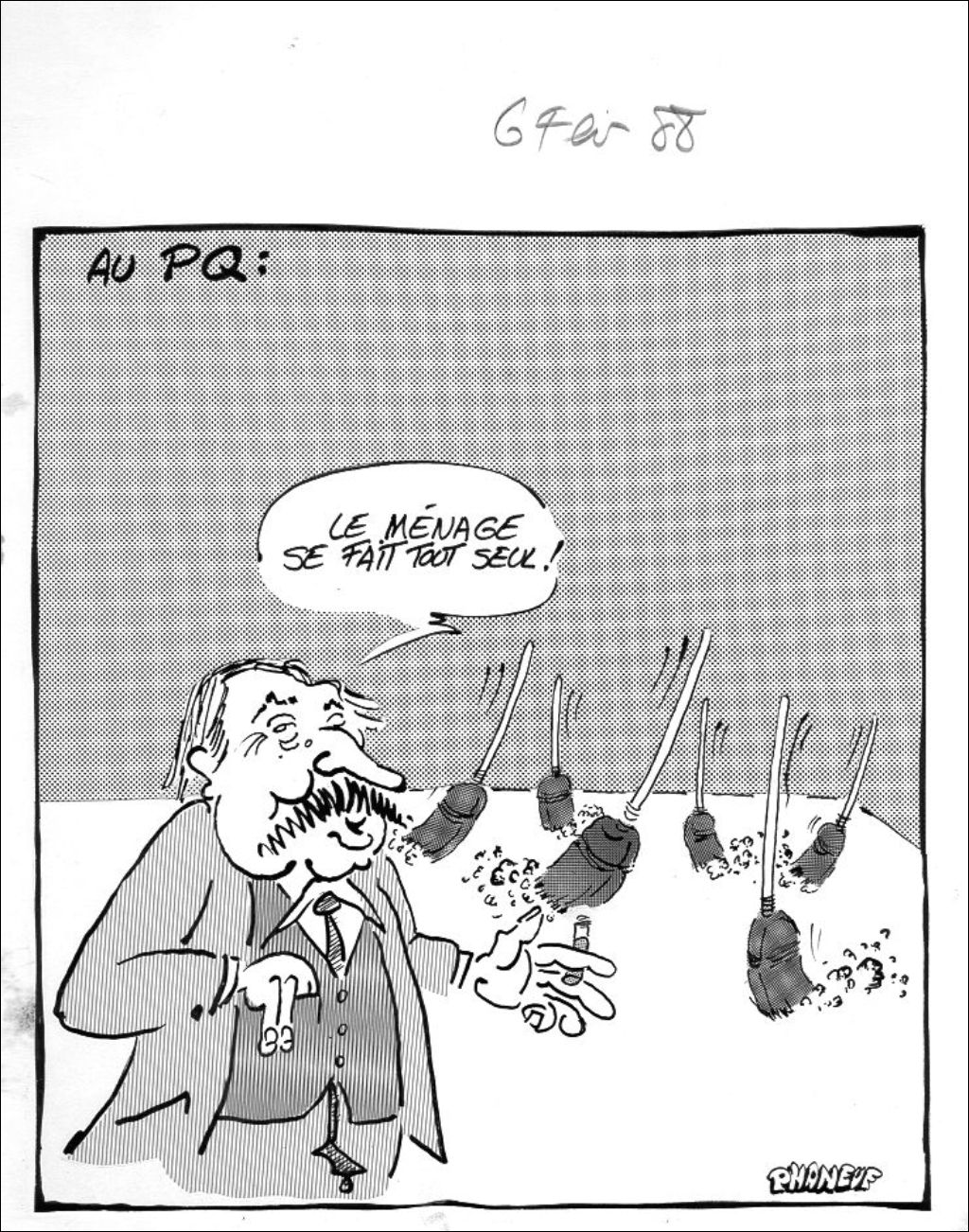 Jacques Parizeau, une cigarette en main, regarde la danse des balais et dit : "Le ménage se fait tout seul!."