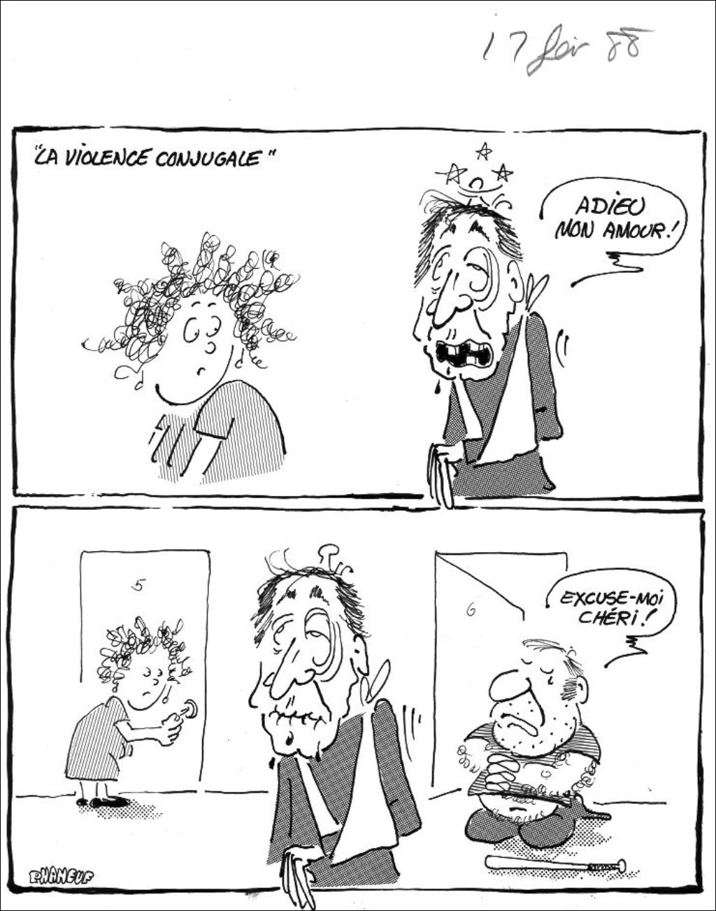 Dans la première partie de la caricature, une femme regarde un homme battu. Celui-ci dit : "Adieu mon amour!" Dans la seconde partie, la femme rentre dans son appartement et, à côté, un deuxième homme à genoux dit au premier : "Excuse-moi chéri!"