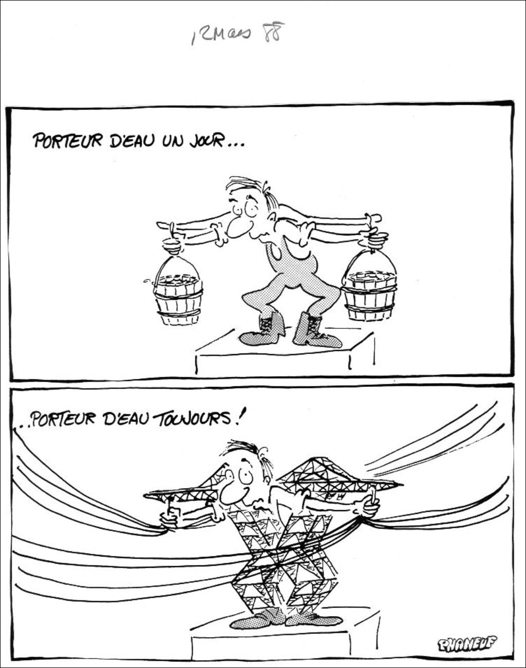 Dans la première partie de la caricature, un homme porte deux seaux d'eau. Dans la seconde partie, l'homme tient dans ses mains des pylônes électriques d'Hydro-Québec
