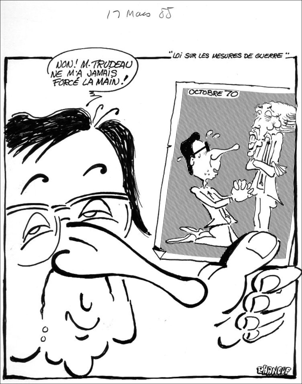Robert Bourassa dit : "Non! M. Trudeau ne m'a jamais forcé la main!". Il nous montre une photo sur laquelle il supplie Pierre Elliott Trudeau. En haut de la photo est inscrit Octobre 70