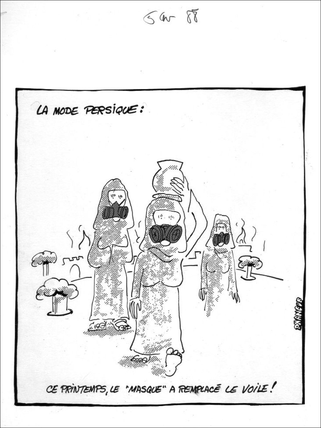 Des femmes portent des masques à gaz. La caricature comporte la phrase suivante : "Ce printemps, le "masque" a remplacé le voile!"