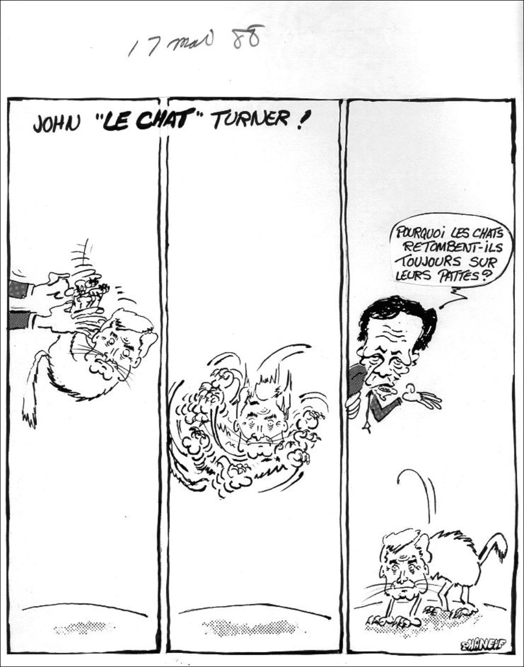 John Turner, déguisé en chat, se fait jeter dans le vide par Jean Chrétien. Ce dernier dit : "Pourquoi les chats retombent-ils toujours sur leurs pattes?"