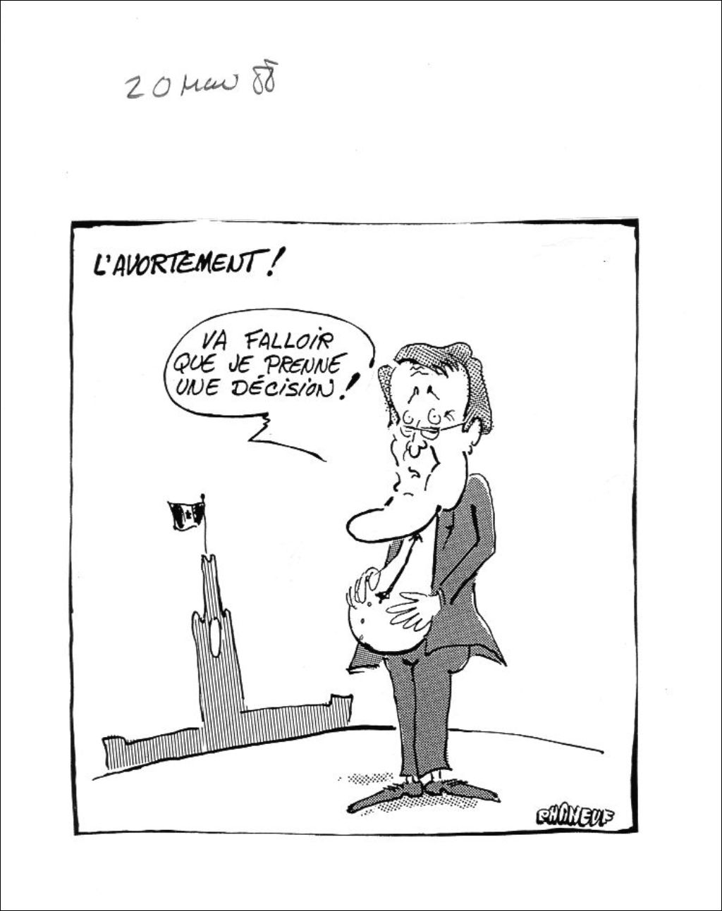 Enceinte, Brian Mulroney dit : "Va falloir que je prenne une décision!" La colline parlementaire d'Ottawa et le drapeau du Canada sont visible à l'arrière-plan