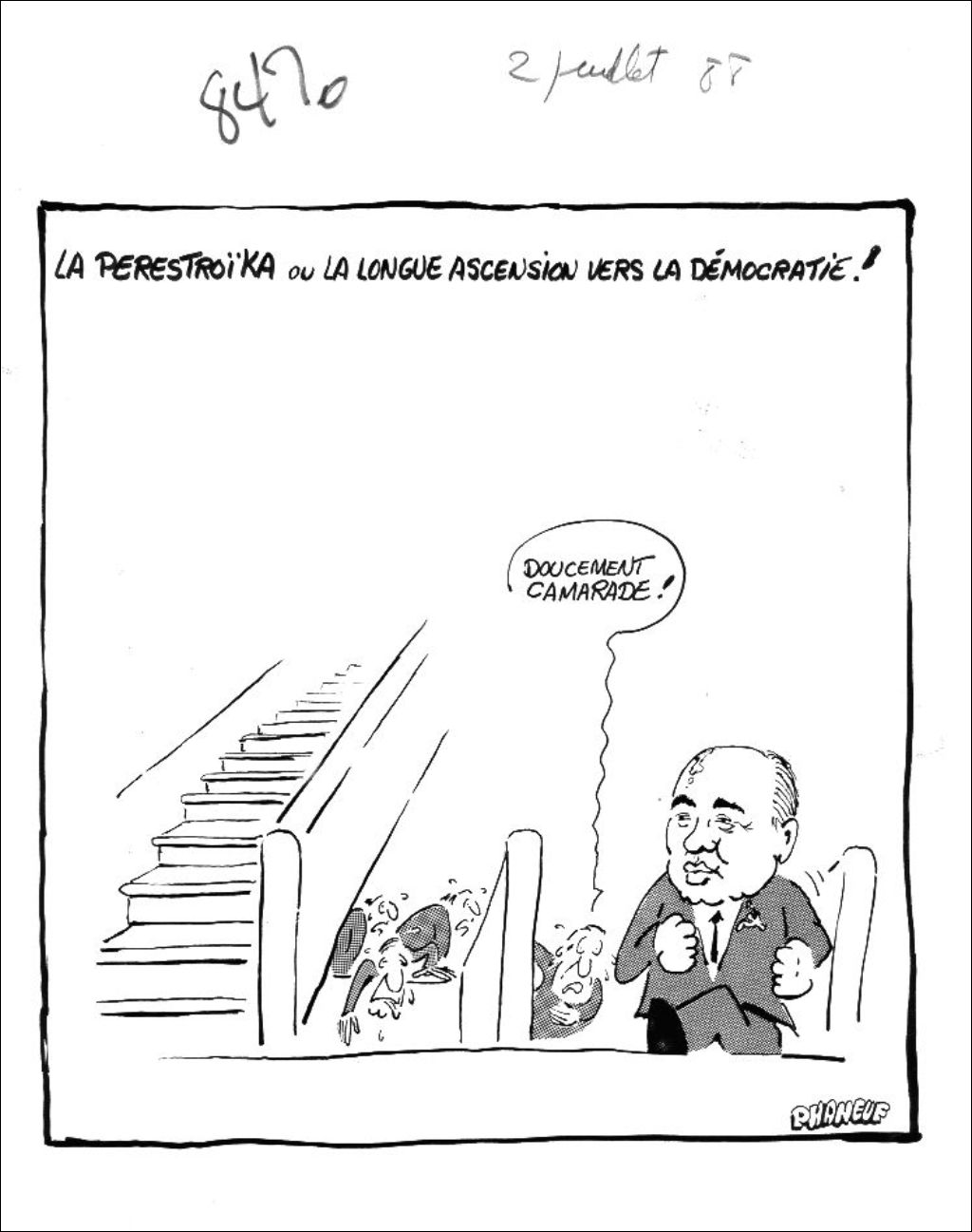 Instigateur de changements, Mikhaïl Gorbatchev essouffle ses compatriotes en montant un escalier. Ceux-ci lui disent : "Doucement camarade!" Gorbatchev porte le signe du drapeau soviétique sur son veston