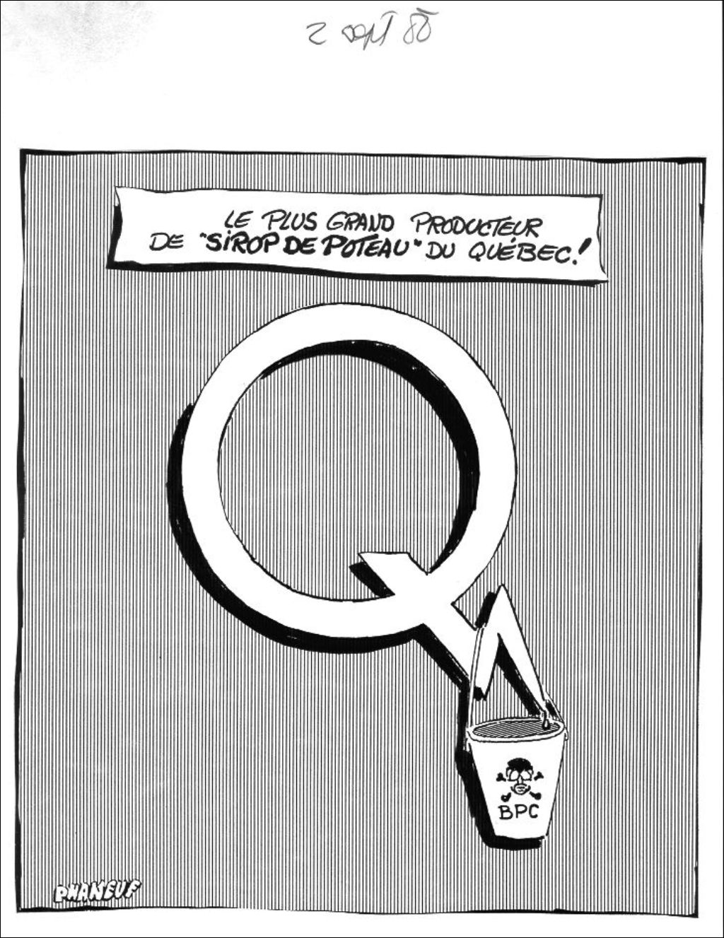 Un seau de BPC pend de la lettre "Q" du logo d'Hydro-Québec