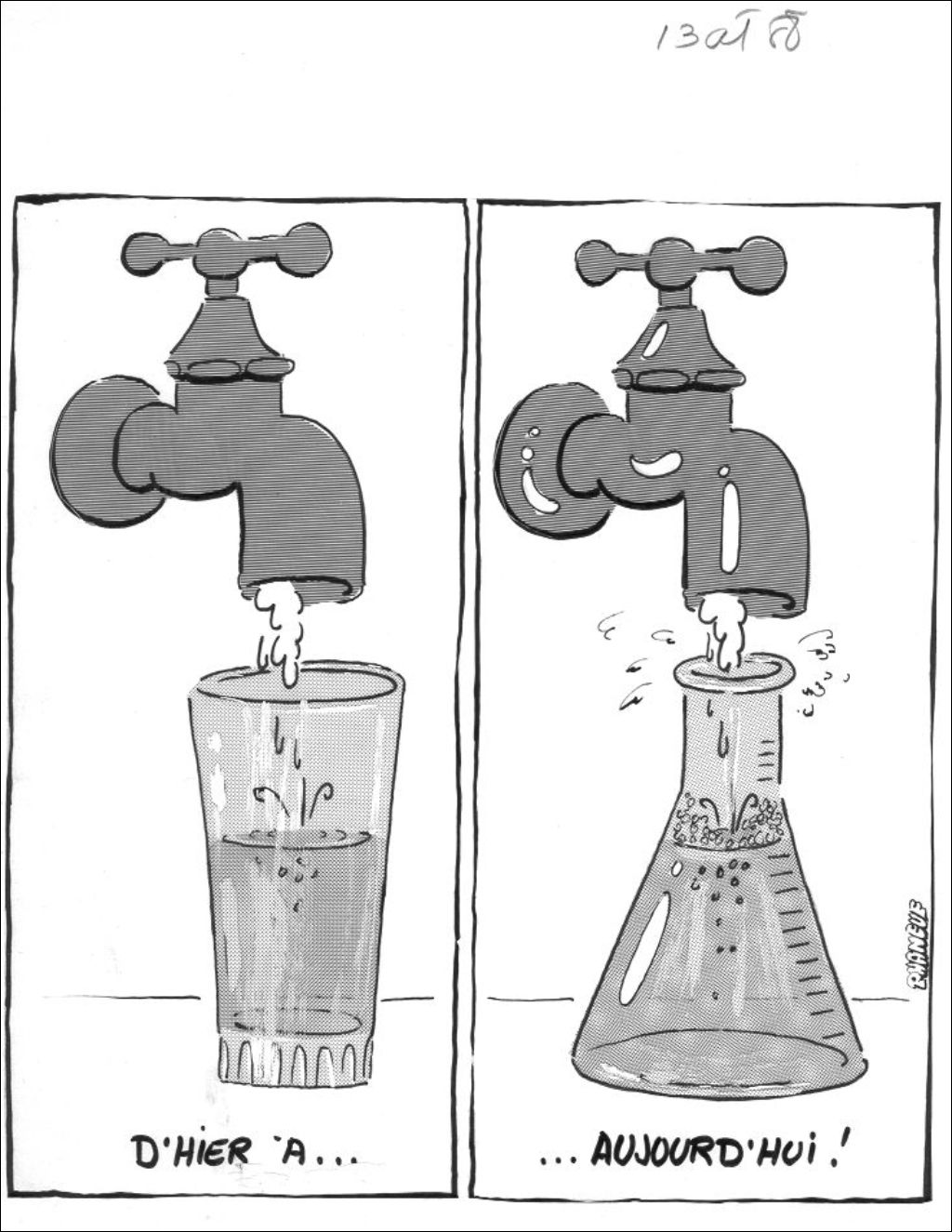 Dans la première partie de la caricature, une eau pure sort du robinet. Dans la seconde partie, une eau chimique sort de ce même robinet