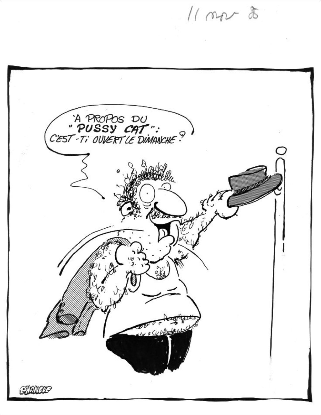 Un homme délabré, en camisole, accroche son chapeau à une patère et dit : "À propos du «Pussy Cat» : C'est-ti ouvert le dimanche?"