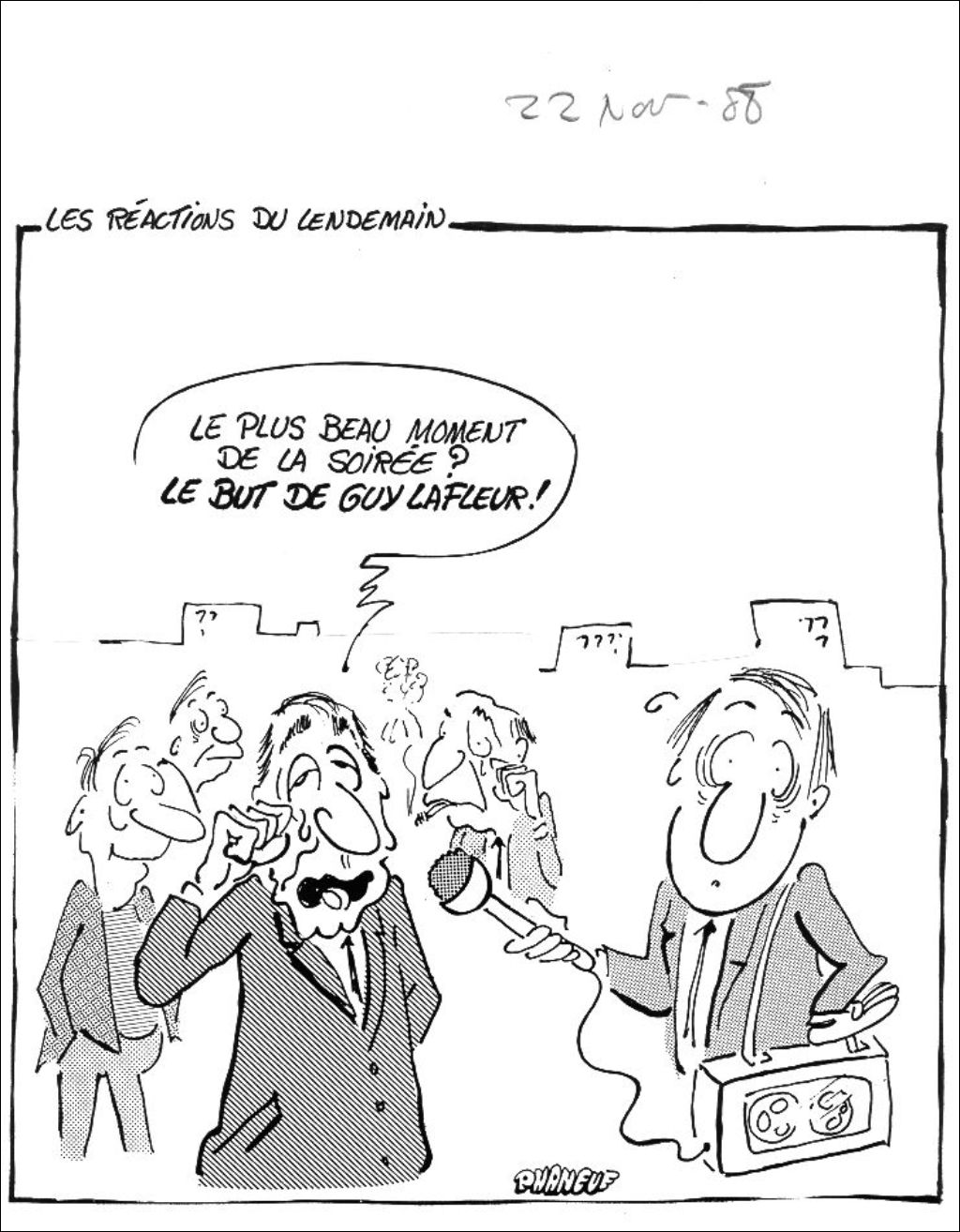 Un homme, les larmes aux yeux, se fait interviewer par un journaliste à propos de la soirée de la veille. Il dit : "Le plus beau moment de la soirée? Le but de Guy Lafleur!"
