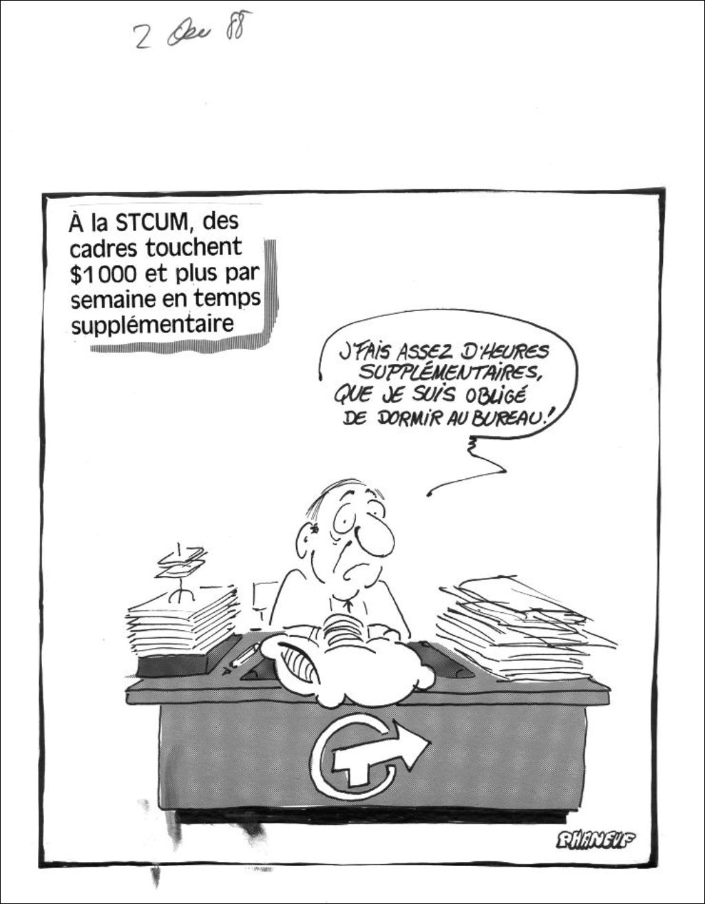 À la STCUM, des cadres touchent $1000 et plus par semaine en temps supplémentaire, 2 décembre 1988, Archives nationales à Montréal, Fonds Jean-Marc Phaneuf, (06M,P575,S4,SS4,P580), Jean-Marc Phaneuf.