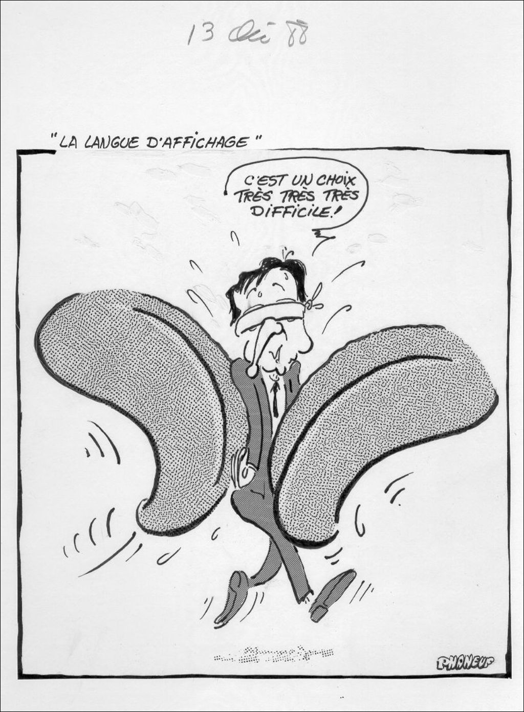 En faisant allusion au problème de la langue d'affichage, Robert Bourassa, les yeux bandés, se fait lécher des deux côtés par deux langues et dit : "C'est un choix très très très difficile!"