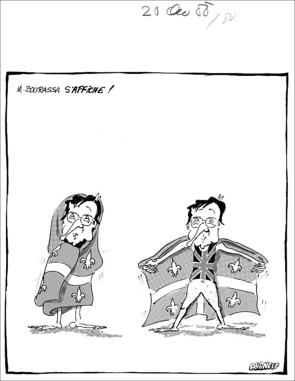 À gauche de la caricature, nous aperçevons Robert Bourassa enveloppé dans un drapeau du Québec. À droite, il ouvre sa cape pour découvrir une camisole à l'effigie du drapeau de la Grande-Bretagne