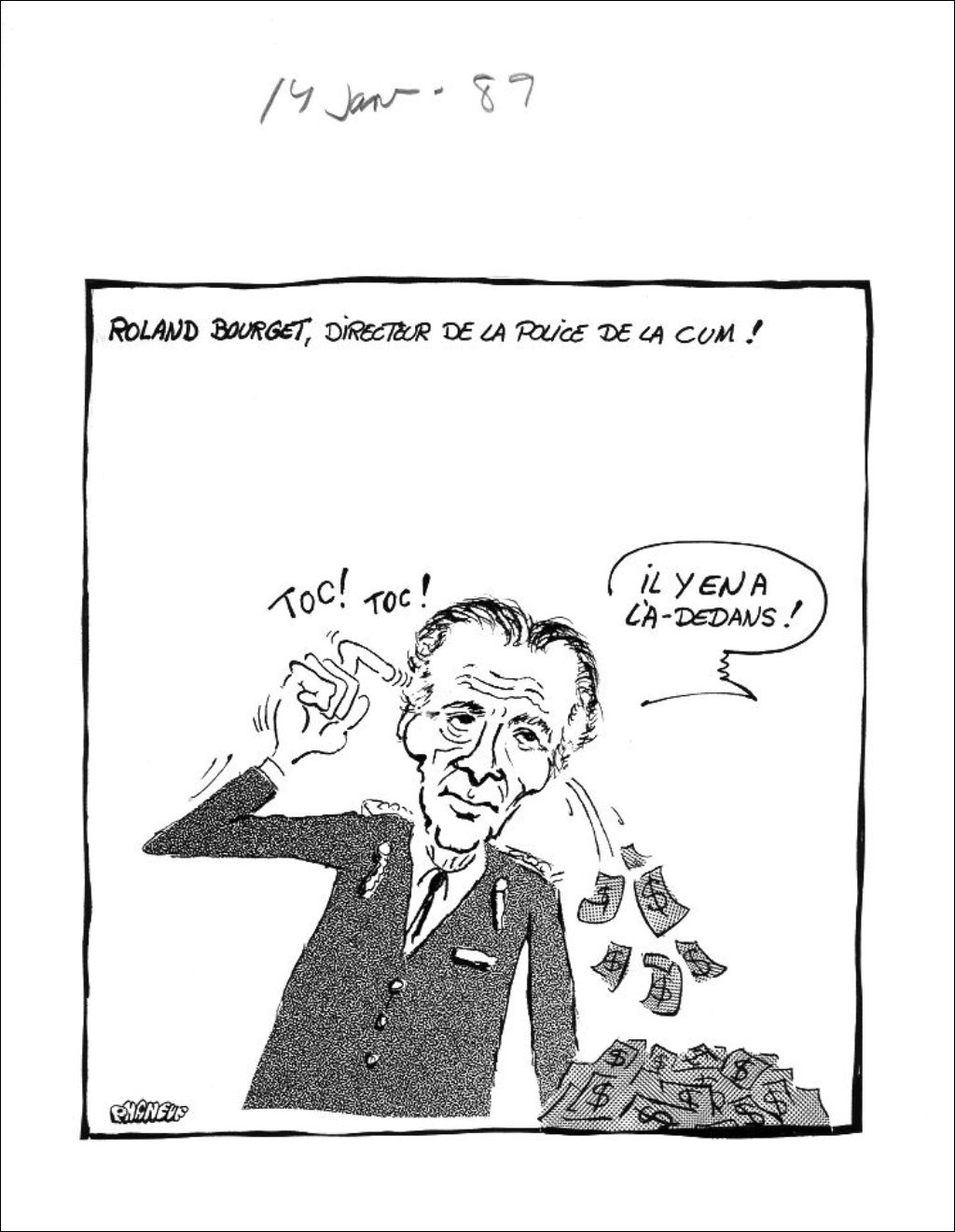 Roland Bourget se frappe la tempe droite avec son index en disant : "Il y en a là-dedans!" Un tas d'argent sort par son oreille gauche