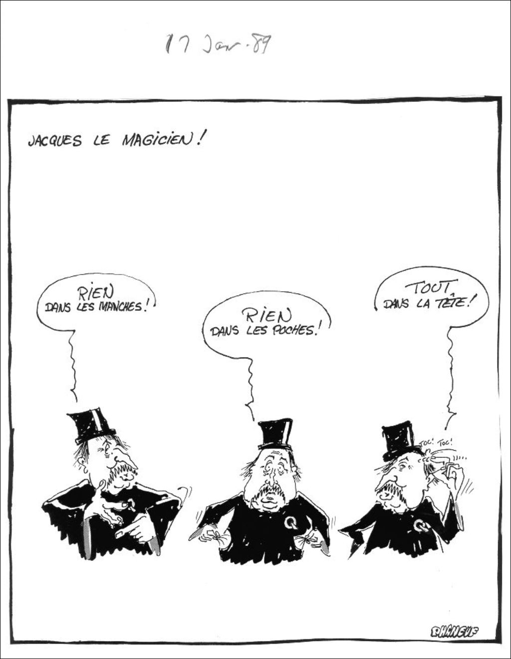 Jacques Parizeau est vêtu d'un costume de magicien portant le logo du Parti québécois. Il dit : "Rien dans les manches! Rien dans les poches! Tout dans la tête!"