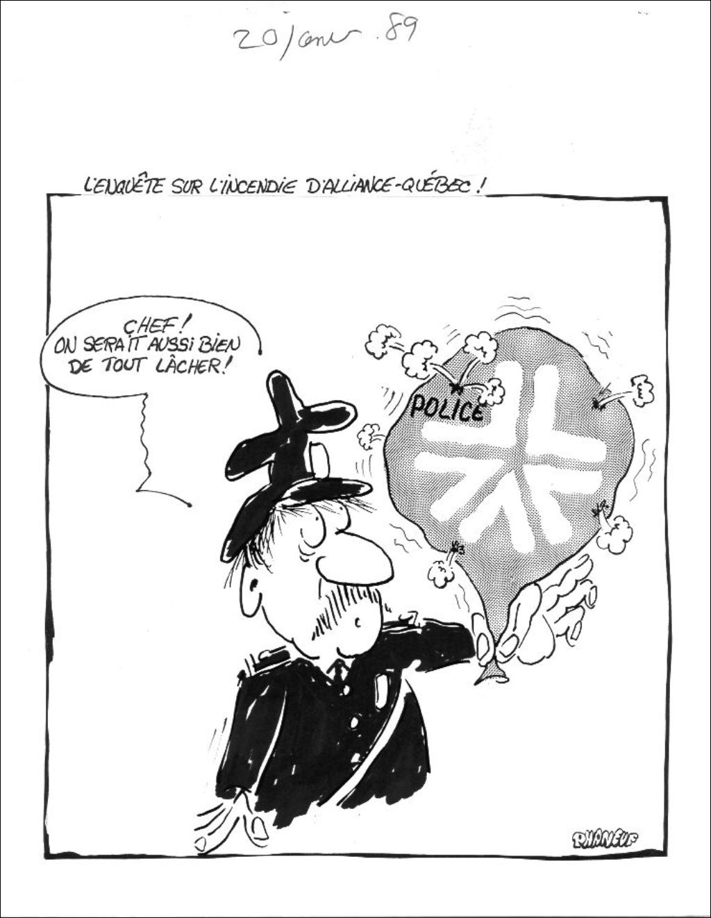 Un policier tient un ballon à l'effigie de la police de la Communauté urbaine de Montréal. Alors que le ballon se dégonfle, le policier dit : "Chef! On serait aussi bien de tout lâcher!"