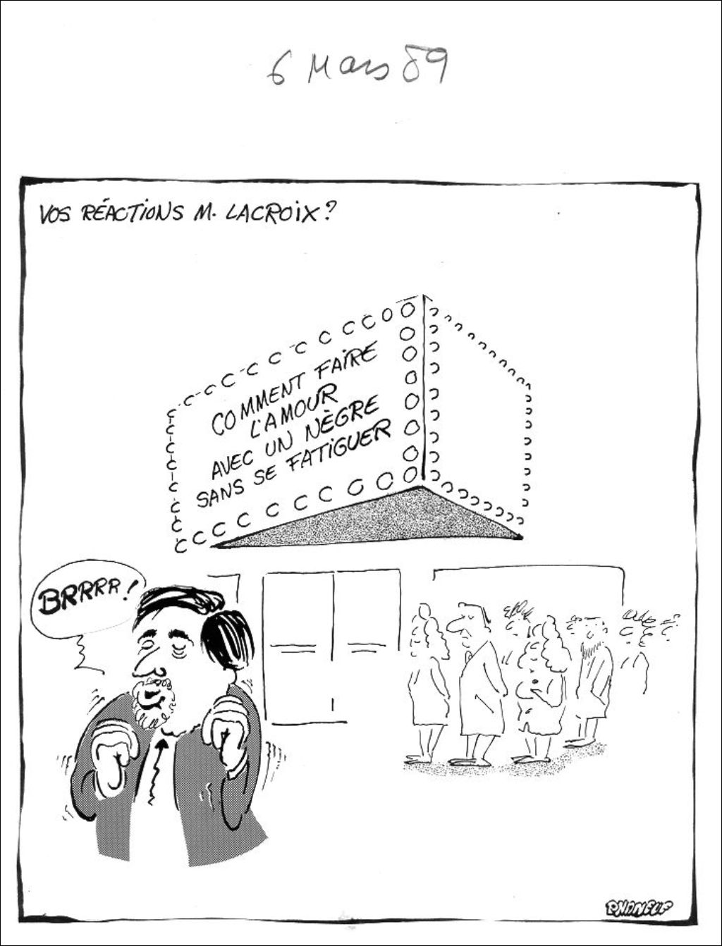 Pierre Lacroix frissonne devant un cinéma où est annoncé le film : "Comment faire l'amour avec un nègre sans se fatiguer"