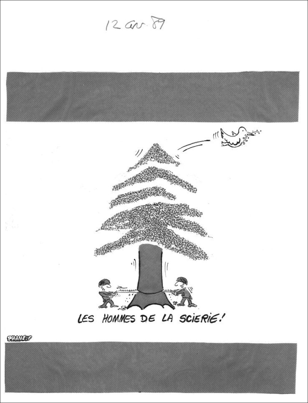 Un oiseau s'envole pendant que deux soldats scient un cèdre du Liban. La caricature est faite sous la forme du drapeau du Liban