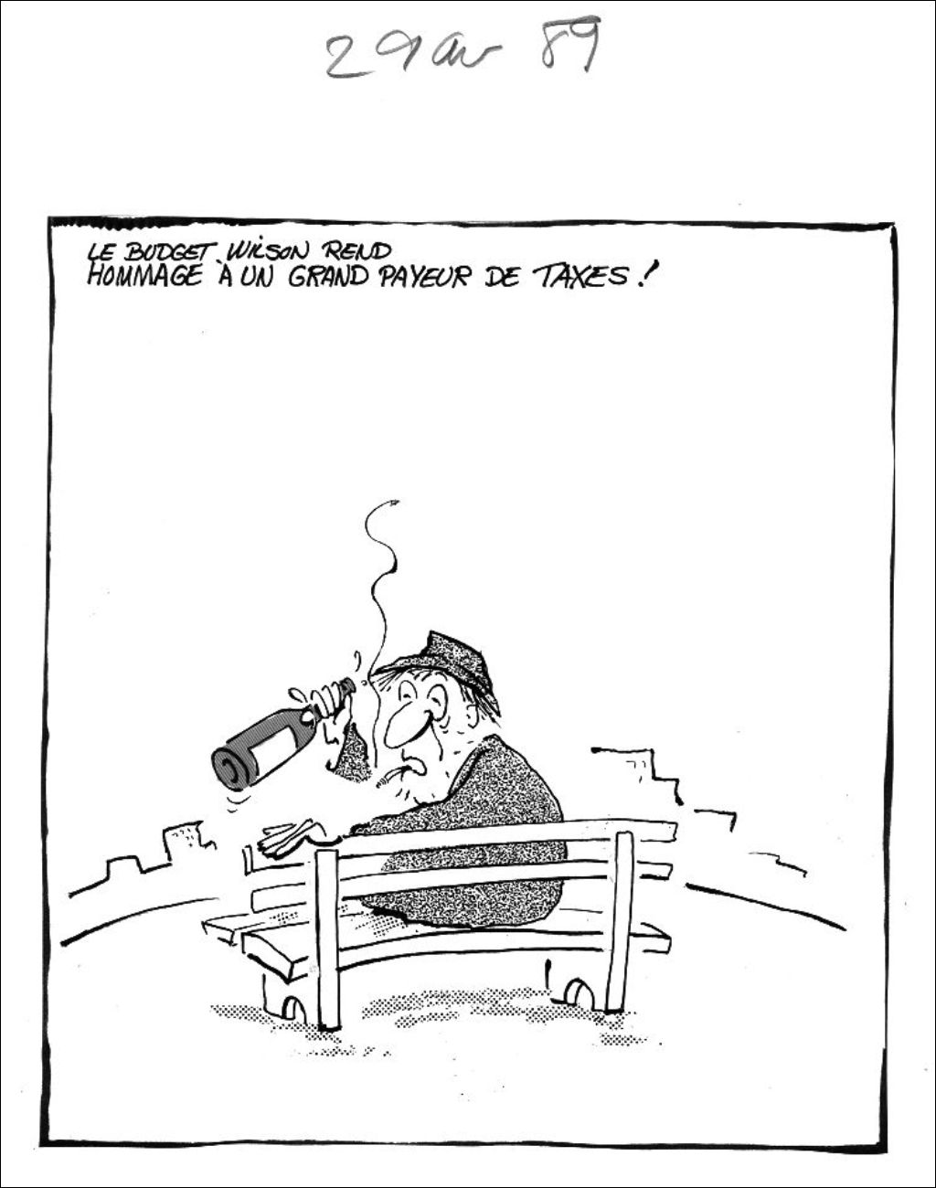 Le budget Wilson rend hommage à un grand payeur de taxes, 29 avril 1989, Archives nationales à Montréal, Fonds Jean-Marc Phaneuf, (06M,P575,S4,SS4,P640), Jean-Marc Phaneuf.