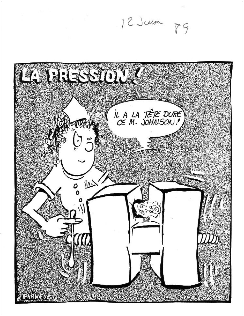Daniel Johnson se fait serrer la tête par une infirmière dans un étau ayant la forme de la lettre «H» du mot hôpital. Celle-ci dit : "Il a la tête dure ce M. Johnson!"