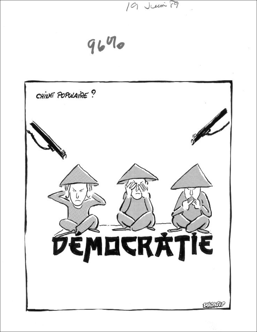 Dans la mire de deux armes à feu, trois chinois vivent la démocratie. Le premier se bouche les oreilles avec les mains, le deuxième les yeux et le troisième la bouche