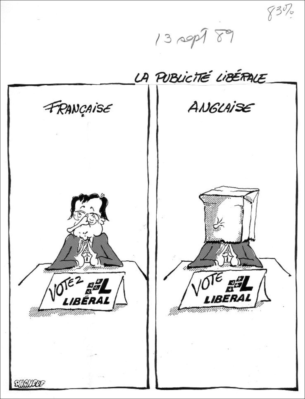 À gauche, le côté français, Robert Bourassa est assis derrière une affiche "Votez Libéral". De l'autre côté, pour la publicité anglaise, Robert Bourassa est assis avec un sac en papier sur la tête. L'affiche mentionne : "Vote Liberal". Nous voyons le logo du Parti libéral du Québec