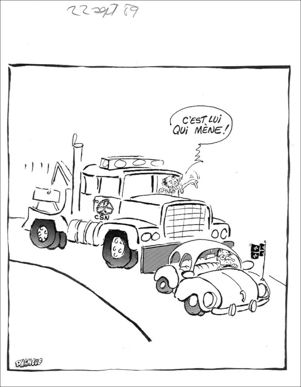 Gérald Larose conduit un camion remorque à l'effigie de la CSN. Il pousse la voiture de Robert Bourassa et dit : "C'est lui qui mène!" Nous voyons le drapeau du Québec et le logo de la CSN