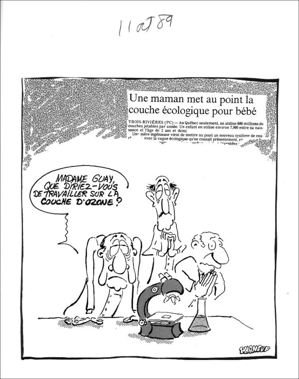 Découragés, trois chercheurs scientifiques demandent à la maman inventrice de la couche écologique : "Madame Guay, que diriez-vous de travailler sur la couche d'ozone?"