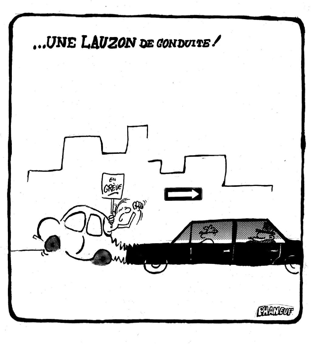 Un personnage se fait conduire par un chauffeur privé et se fait accrocher par une petite voiture dont le conducteur tient une pancarte se lisant ainsi : "En grève"