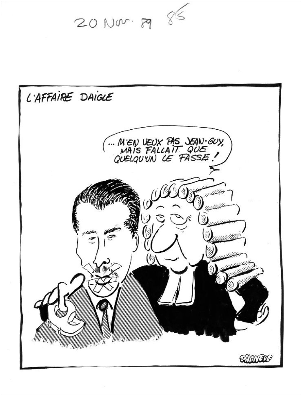 Pour éviter Jean-Guy Tremblay de donner libre cours à sa verve, son avocat doit le bâillonner. Il lui dit : "...M'en veux pas Jean-Guy, mais fallait que quelqu'un le fasse!"
