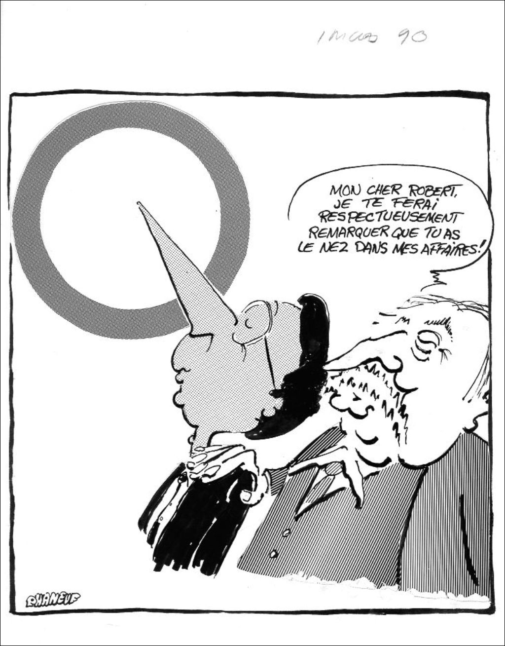 Le nez de Robert Bourassa représente la queue du logo du Parti québécois. Jacques Parizeau lui dit : "Mon cher Robert, je te ferai respectueusement remarquer que tu as le nez dans mes affaires!"