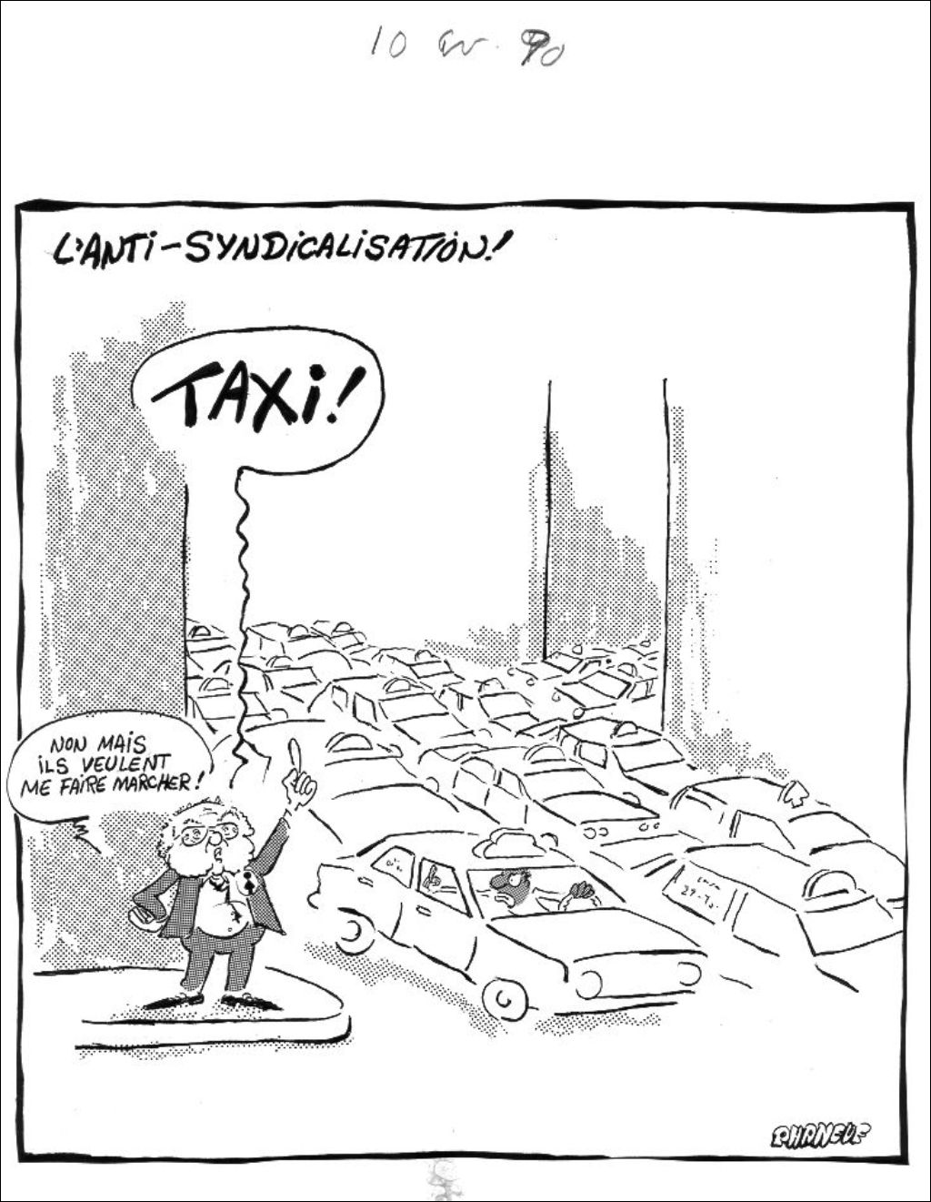 Appelant un taxi au coin d'une rue achalandée, Louis Laberge voit les voitures passer sans s'arrêter. Recevant même un doigt d'honneur de la part de l'un des chauffeurs, il dit : "Non mais ils veulent me faire marcher!" Il porte le logo de la FTQ