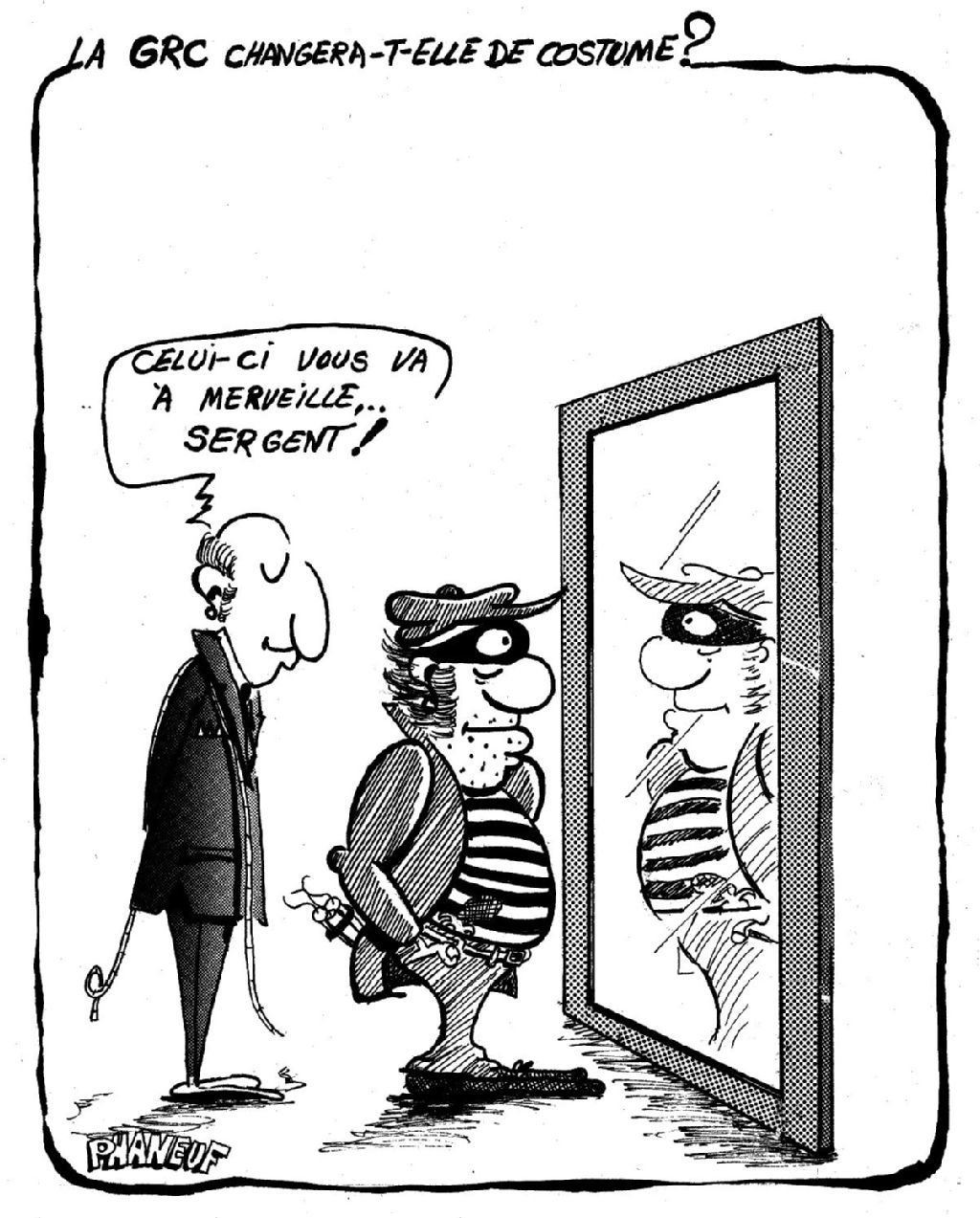 Un sergent de la Gendarmerie royale du Canada (GRC) est en train d'essayer son nouveau costume (costume de prisonnier). Le tailleur lui dit : "Celui-ci vous va à merveille... Sergent!"