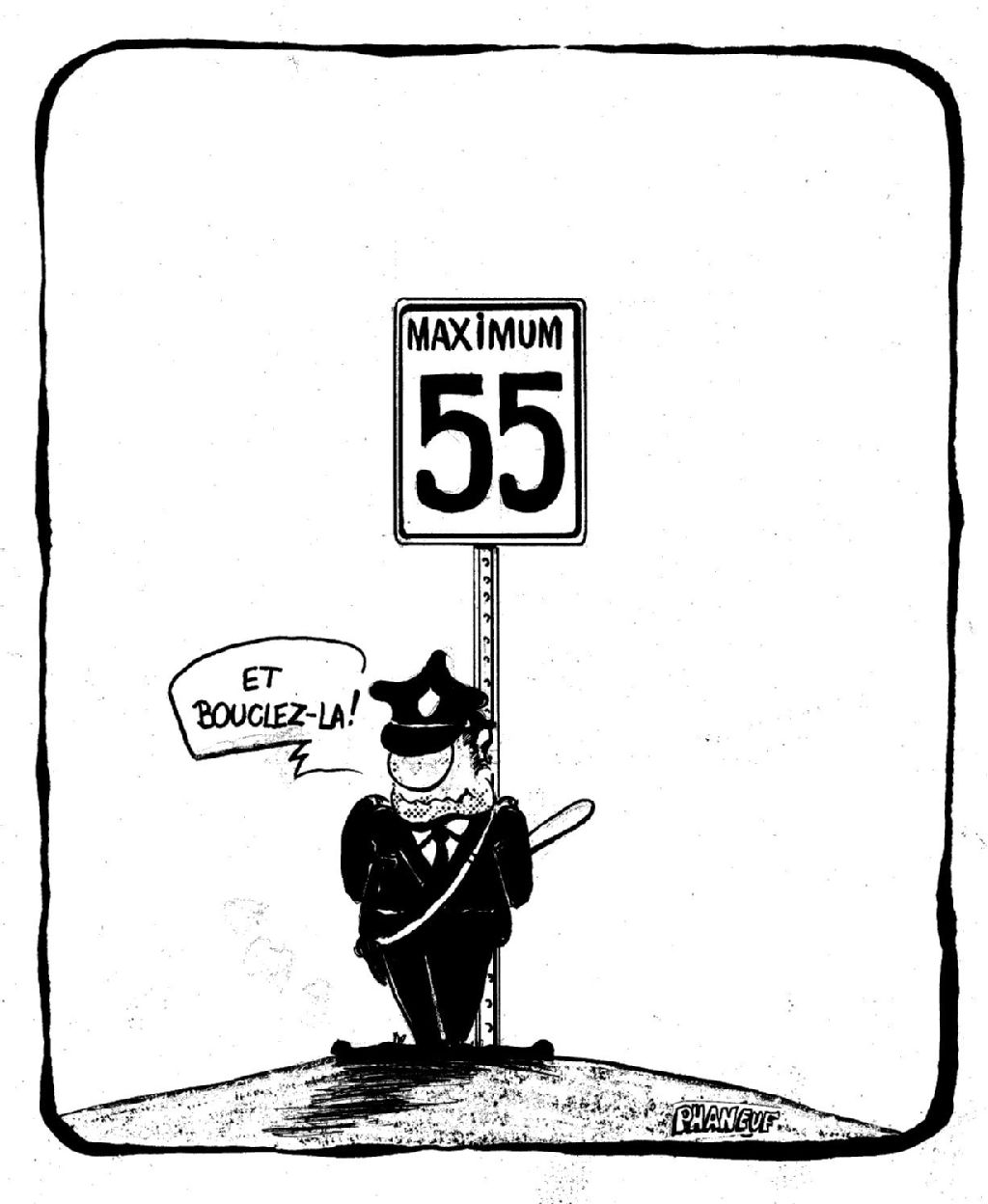 Devant un panneau indiquant la limite de vitesse, un policier dit : "Et bouclez-la!"