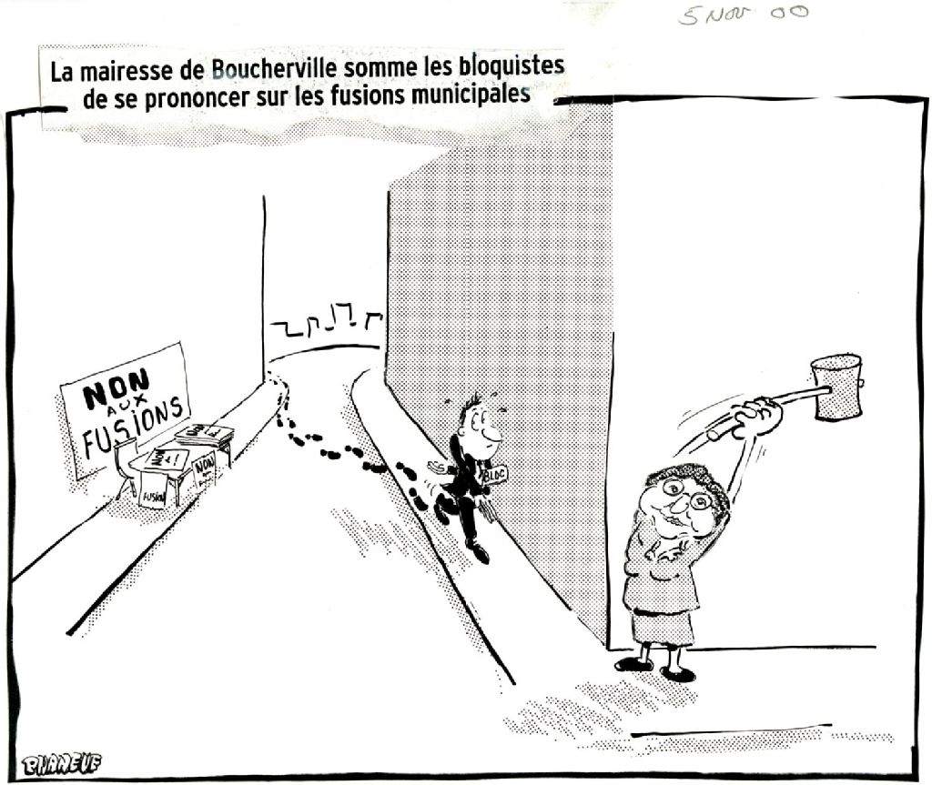 La mairesse de Boucherville somme les bloquistes de se prononcer sur les fusions municipales, 3 septembre 2000, Archives nationales à Montréal, Fonds Jean-Marc Phaneuf (ajout en attente de traitement), (06M,P575,S4,SS5,P1003), Jean-Marc Phaneuf.