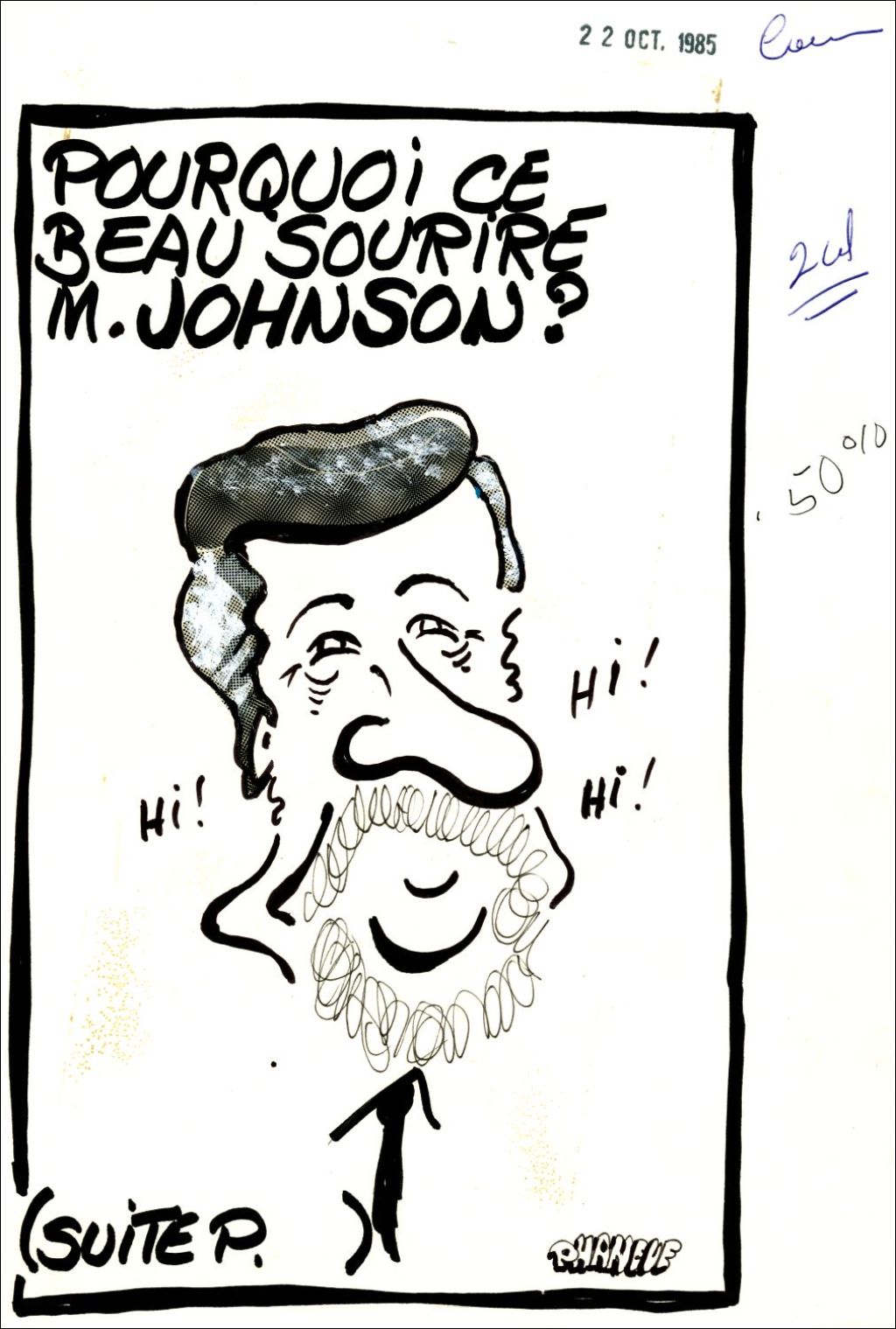 Pourquoi ce beau sourire M. Johnson, 22 octobre 1985, Archives nationales à Montréal, Fonds Jean-Marc Phaneuf (ajout en attente de traitement), (06M,P575,S4,SS5,P935), Jean-Marc Phaneuf.