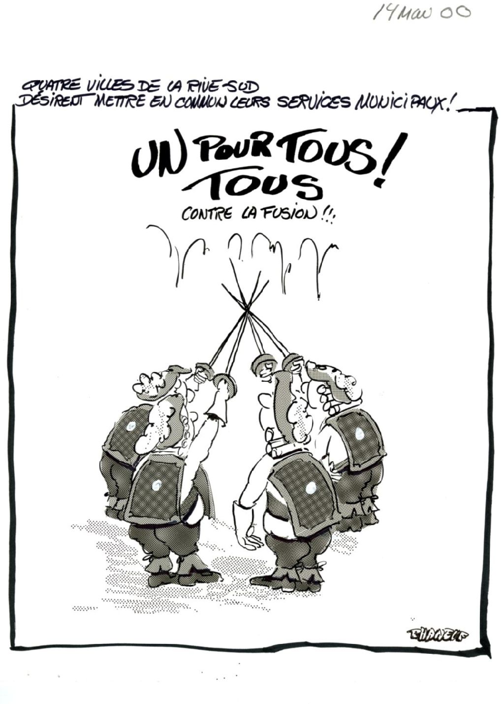 Quatre villes de la rive-sud désirent mettre en commun leurs services municipaux, 14 mai 2000, Archives nationales à Montréal, Fonds Jean-Marc Phaneuf (ajout en attente de traitement), (06M,P575,S4,SS5,P996), Jean-Marc Phaneuf.