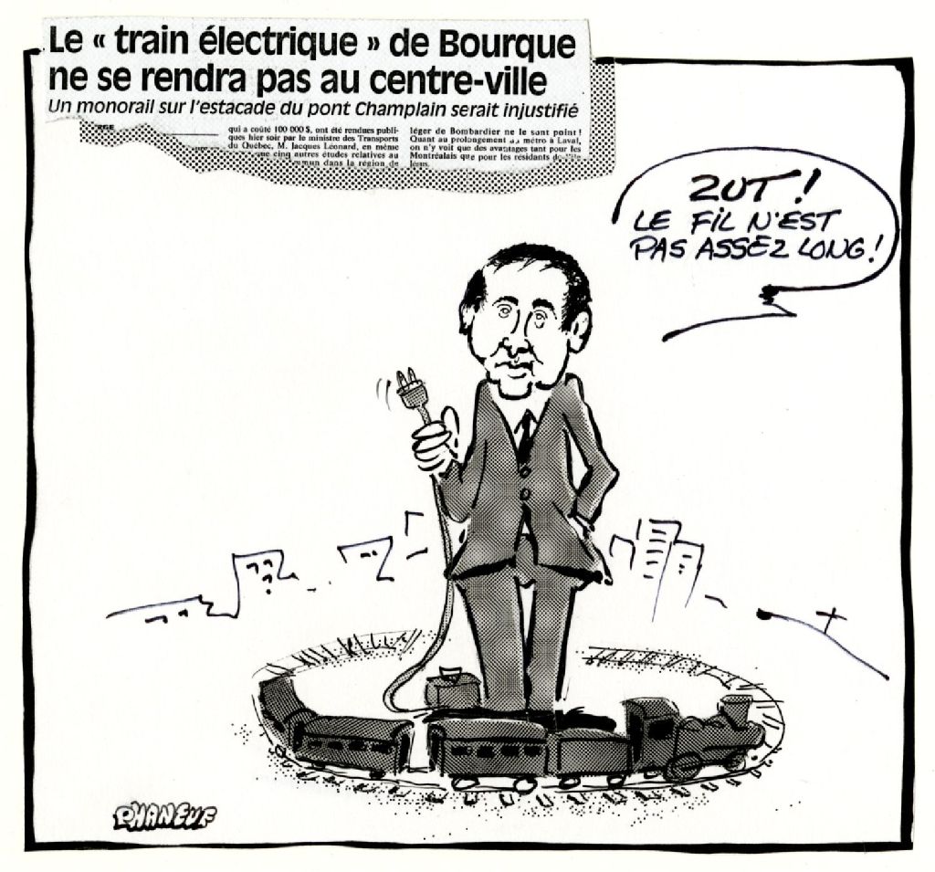 Le "train électrique" de Bourque ne se rendra pas au centre ville, [1987?], Archives nationales à Montréal, Fonds Jean-Marc Phaneuf (ajout en attente de traitement), (06M,P575,S4,SS6,P131), Jean-Marc Phaneuf.