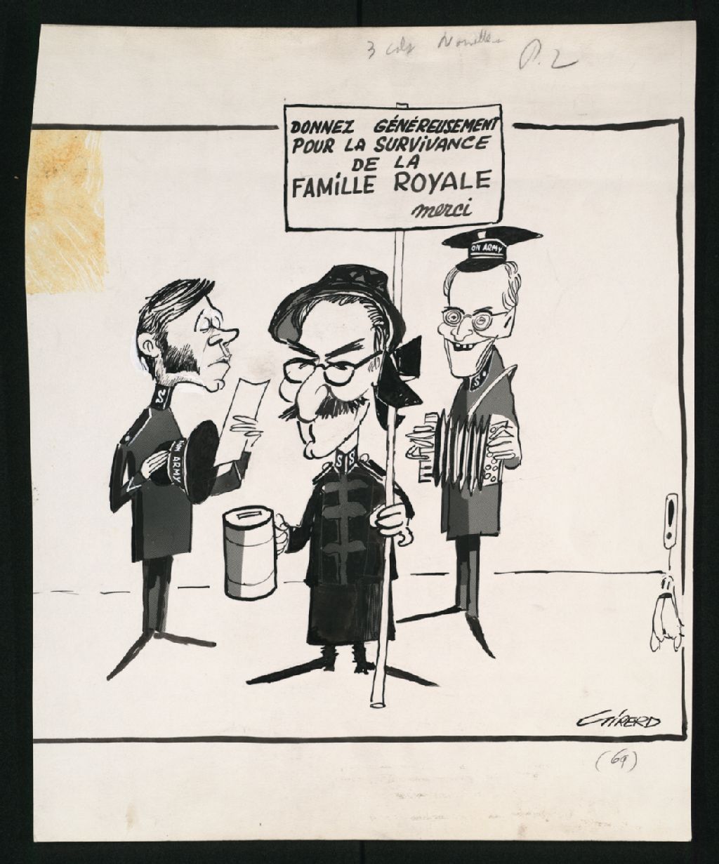 Trois hommes dont Michel Chartrand, habillés en volontaires de l'Armée du salut, sollicitent des dons pour la survivance de la famille royale