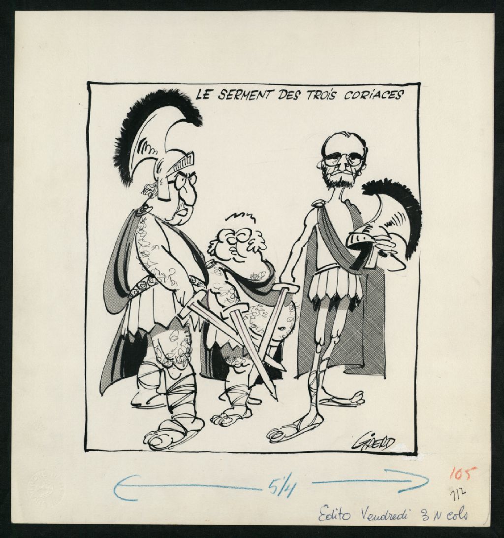 Cette pièce montre Yvon Charbonneau, Louis Laberge et Marcel Pépin déguisés en soldats romains
